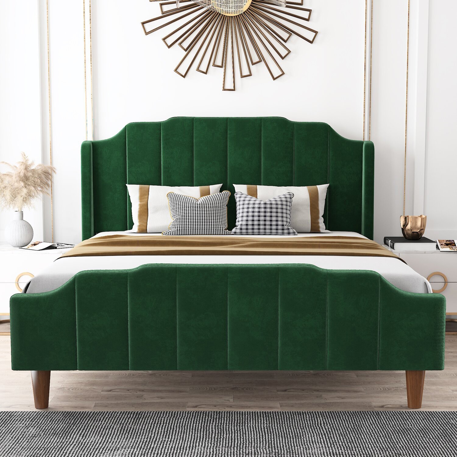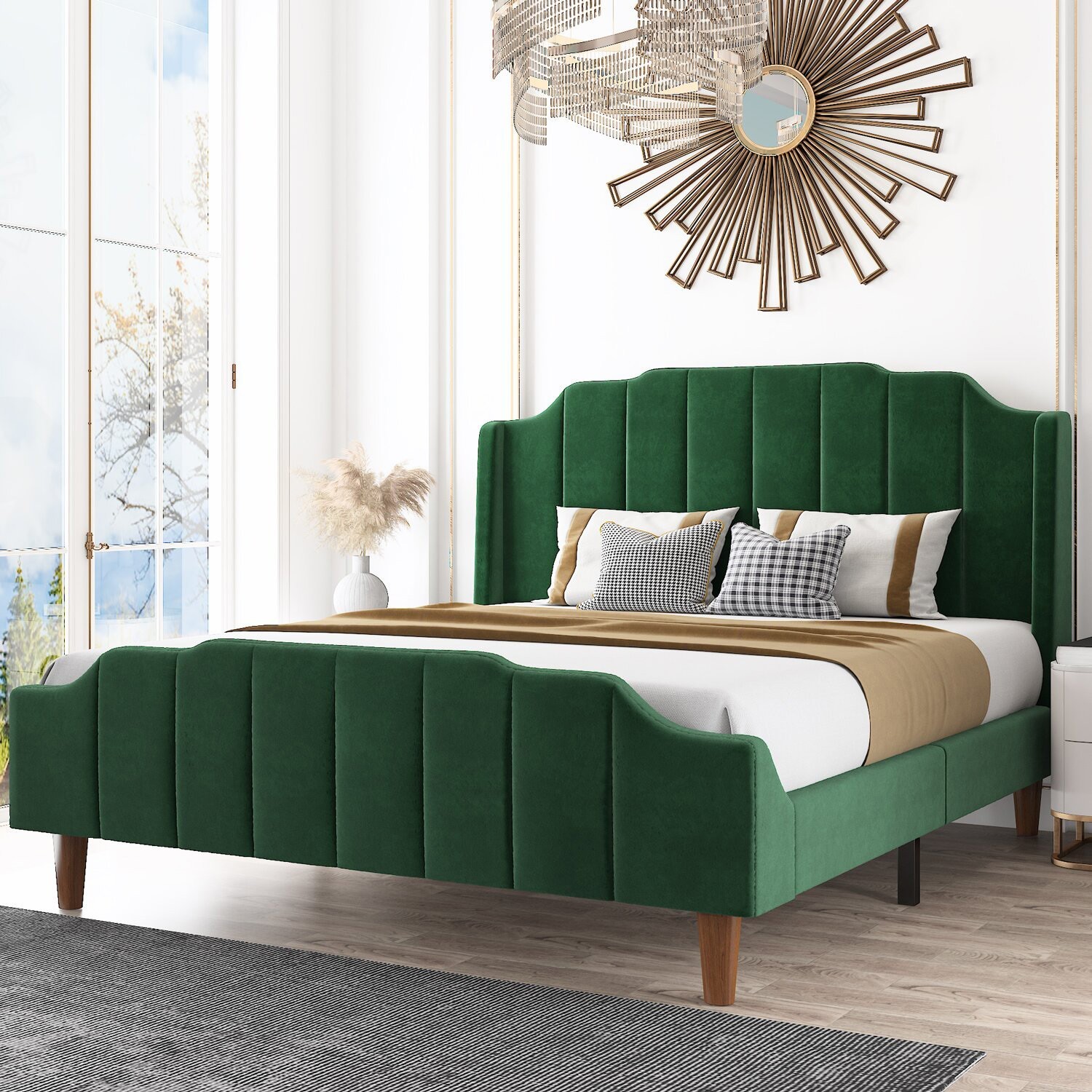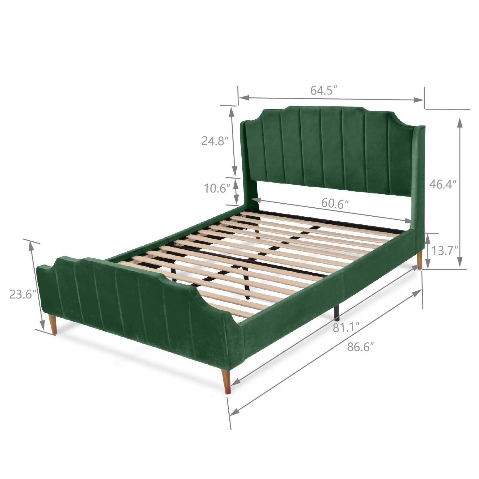 Kavisli döşemeli başlıklı ahşap kadife kraliçe karyola, güçlü ahşap çıta desteklidir.