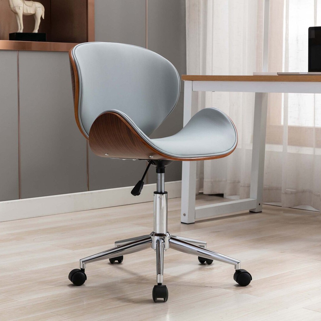 İkonik yüzyıl ortası modern tasarımlarından ilham alan bu zarif çalışma sandalyesi, zengin ceviz kaplamalı kıvrımlı, kavisli bir ahşap kabuğa sahipken, yastıklı iç kısım, temizlemesi kolay siyah suni deri döşemeyle kaplanmıştır.