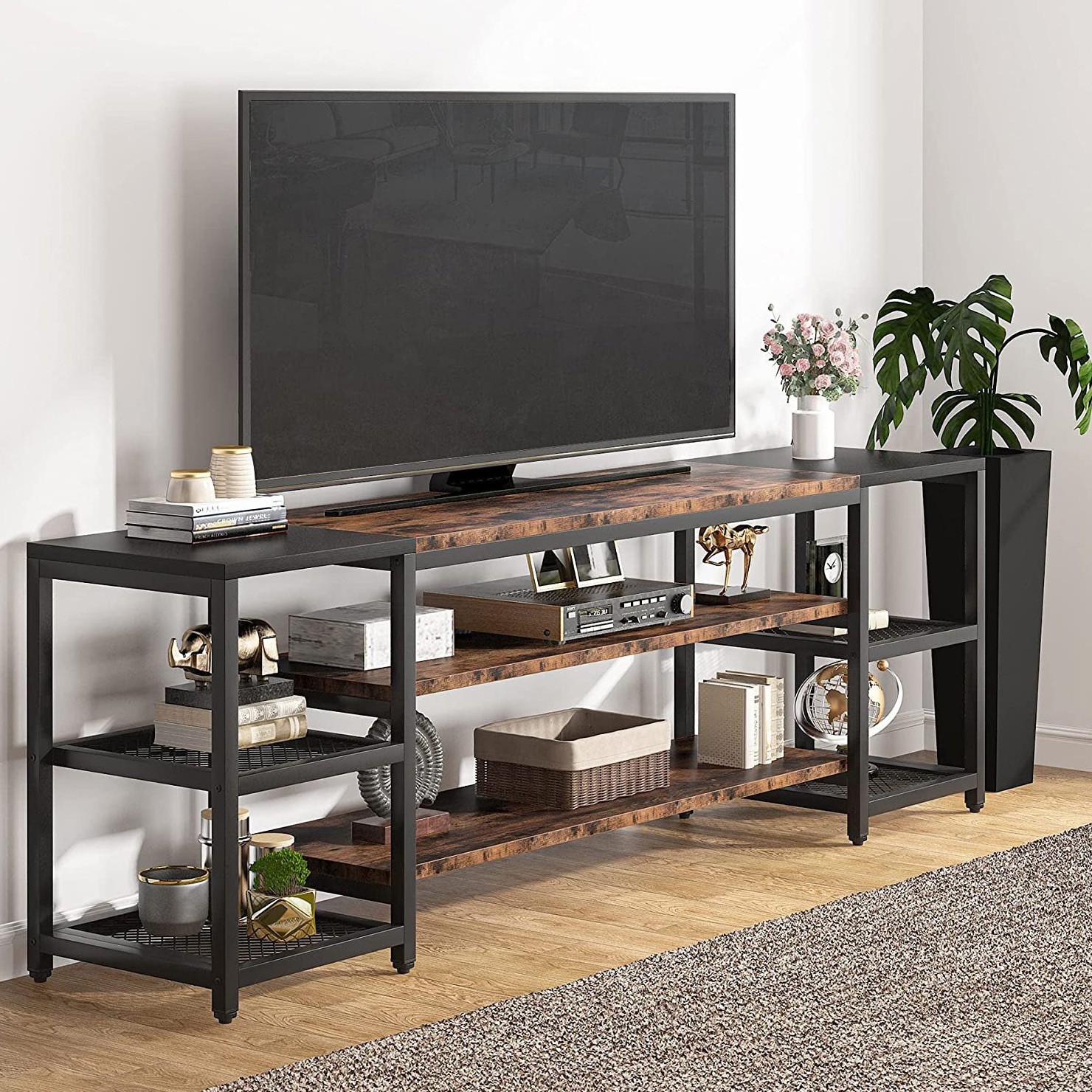 Bu TV sehpasının karışık malzeme görünümü, endüstriyel esintiler taşıyan dekora sahip evlerde iyi sonuç verir. Çerçevesi, siyah ve rustik bir kaplamada metalden üretilmiştir.