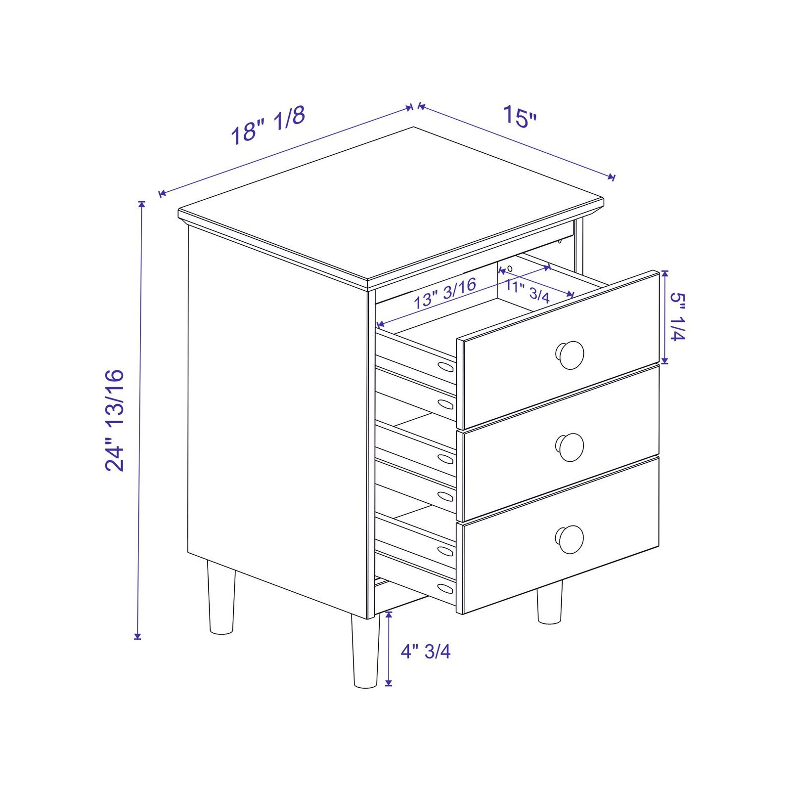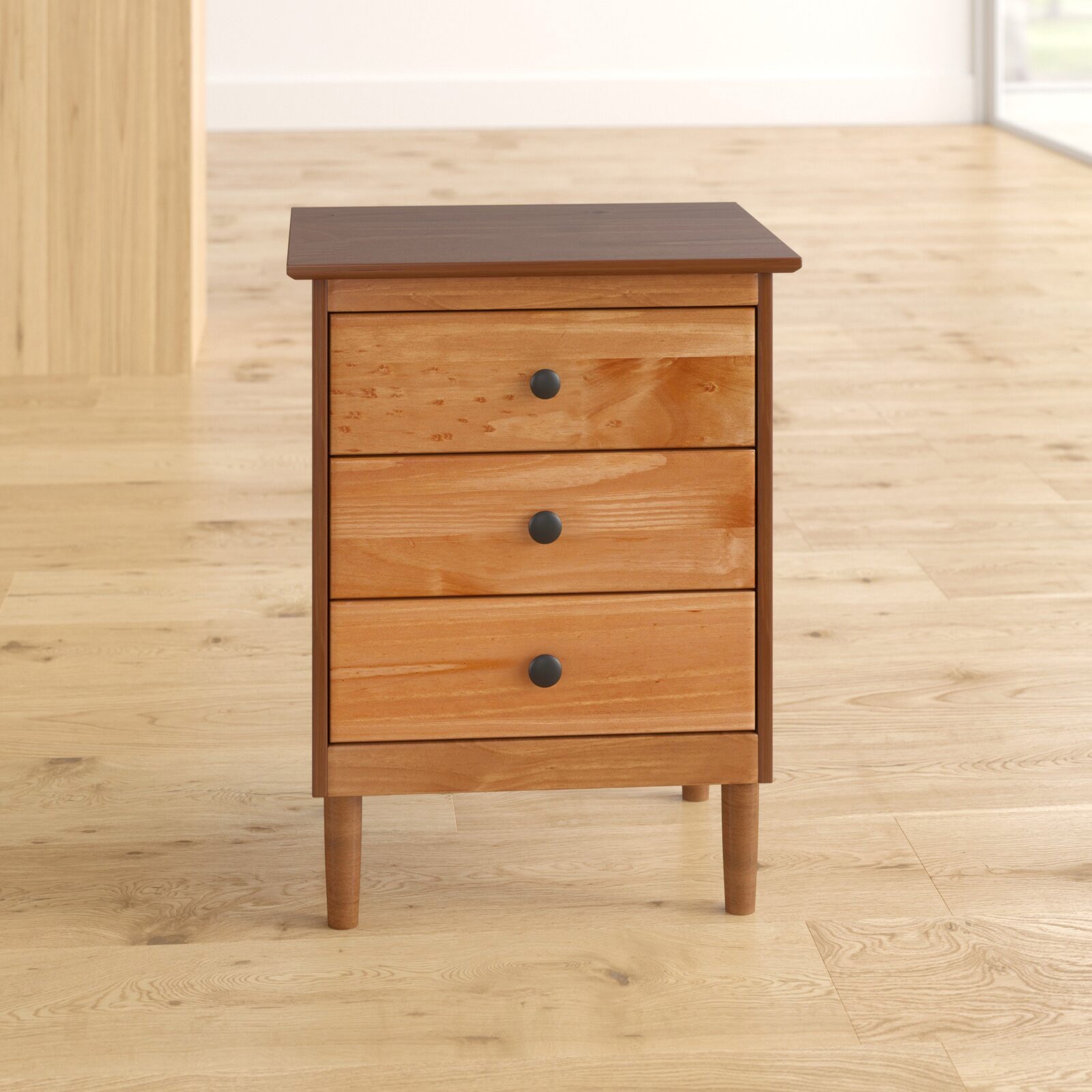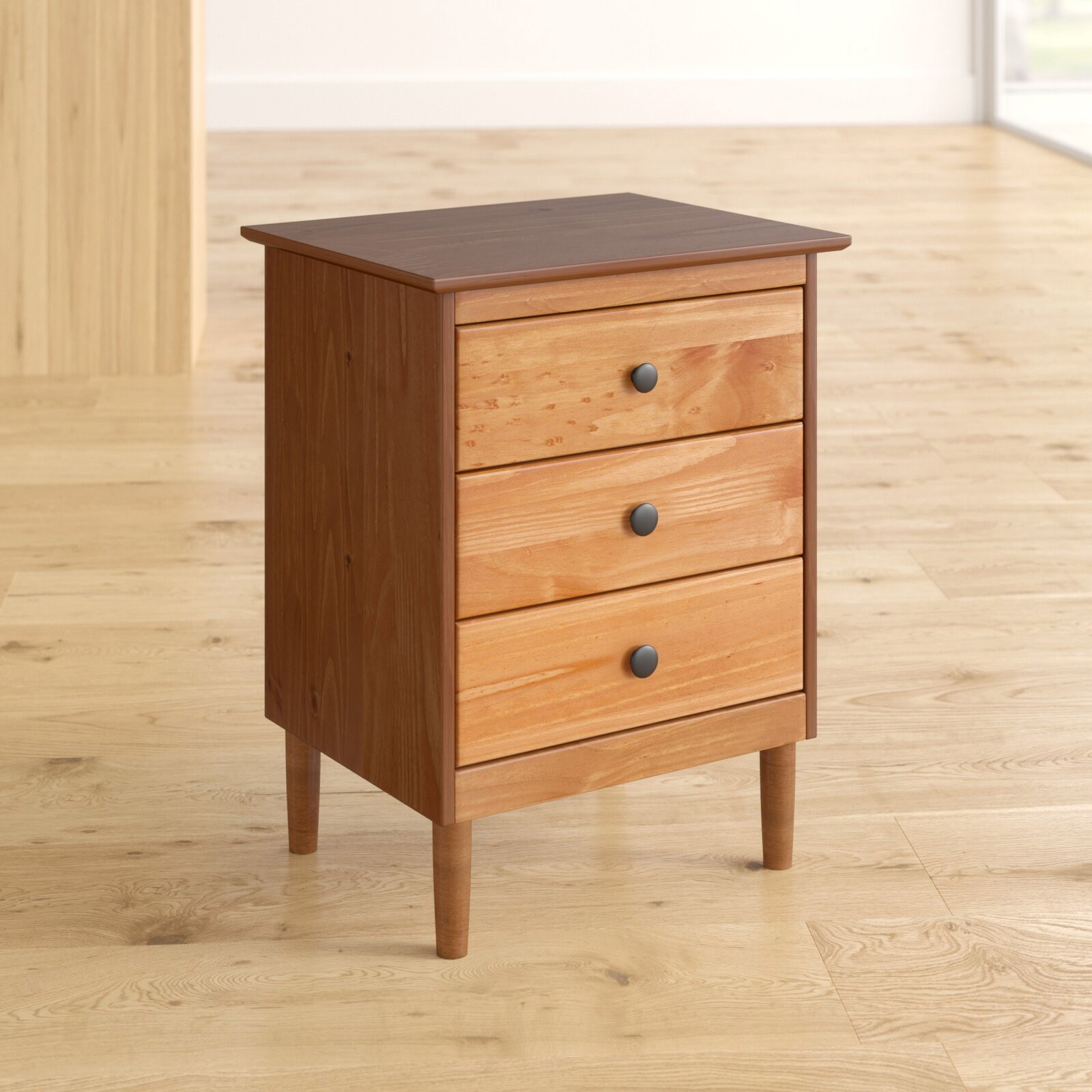 Yüzyıl ortası modern tasarım ve geleneksel tarz, bu üç çekmeceli komodinde kusursuz bir şekilde bir araya geliyor. Çam ve işlenmiş ahşaptan hazırlanmış bu komidin, basit pervazlar ve dört konik dübel ayağı ile kutu gibi bir siluete sahiptir. Siyah düğmelere sahip üç çekmece, tüm başucu temel ihtiyaçlarınız için gözden uzak bir saklama alanı sunar.