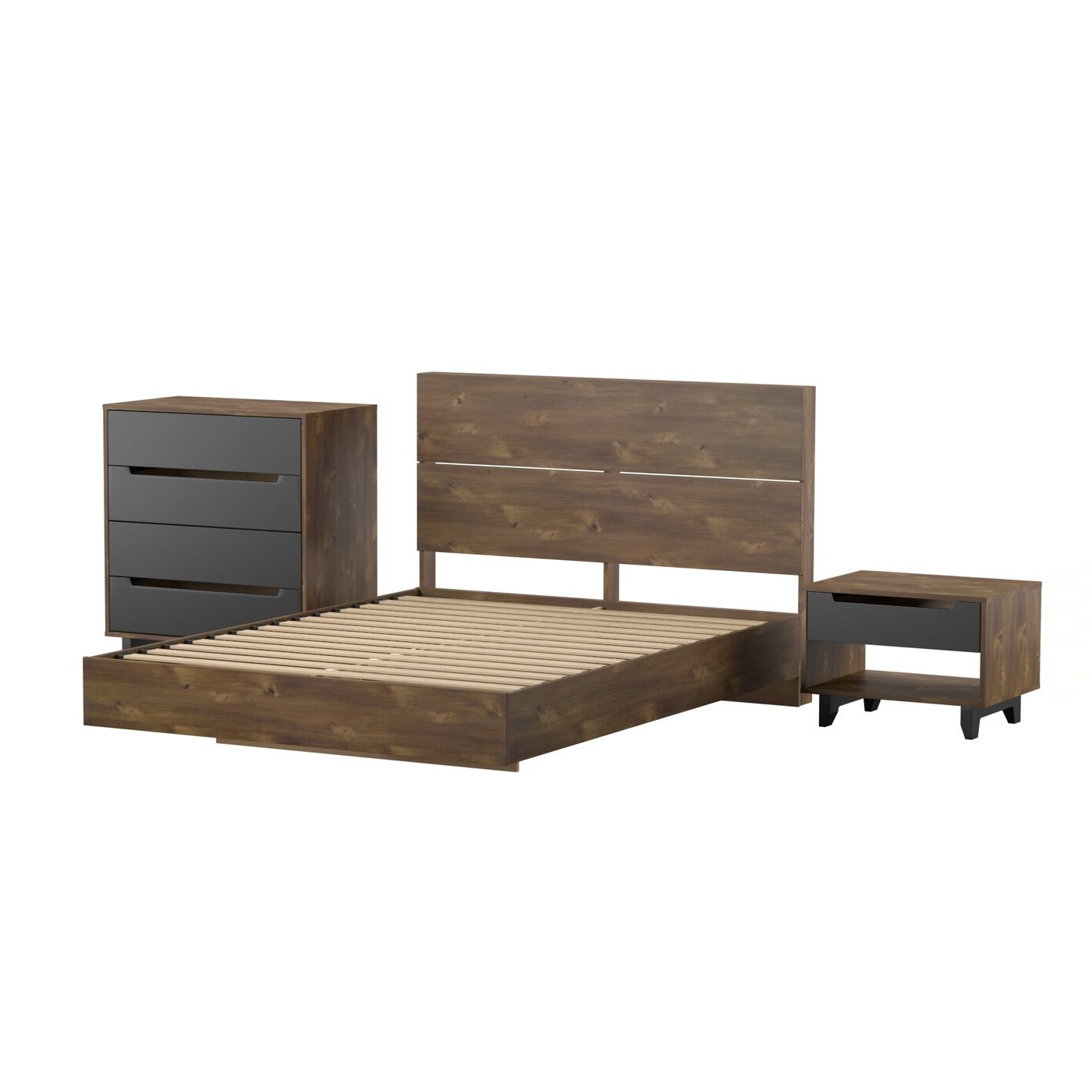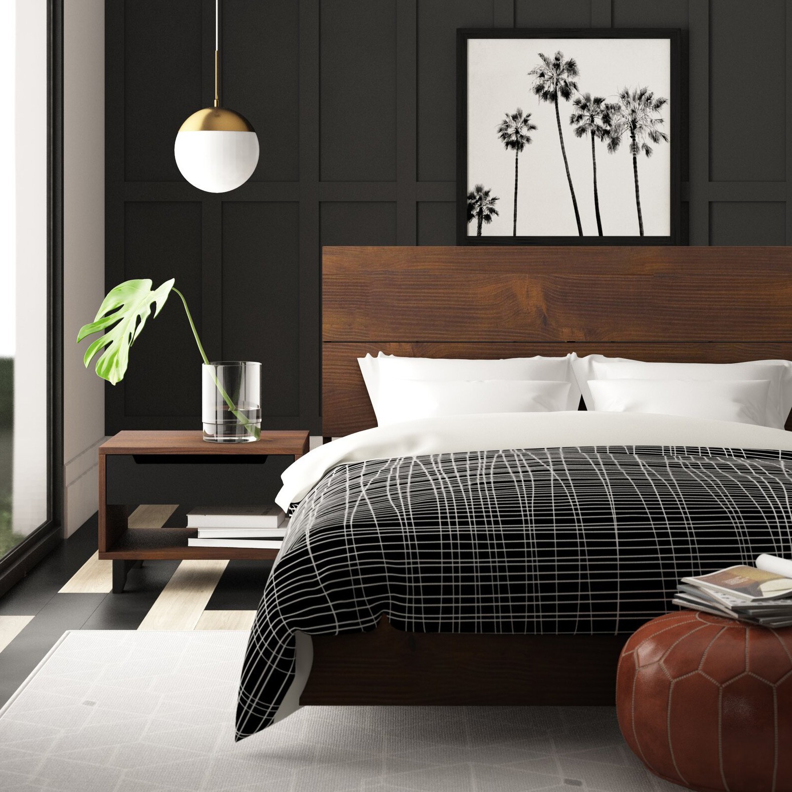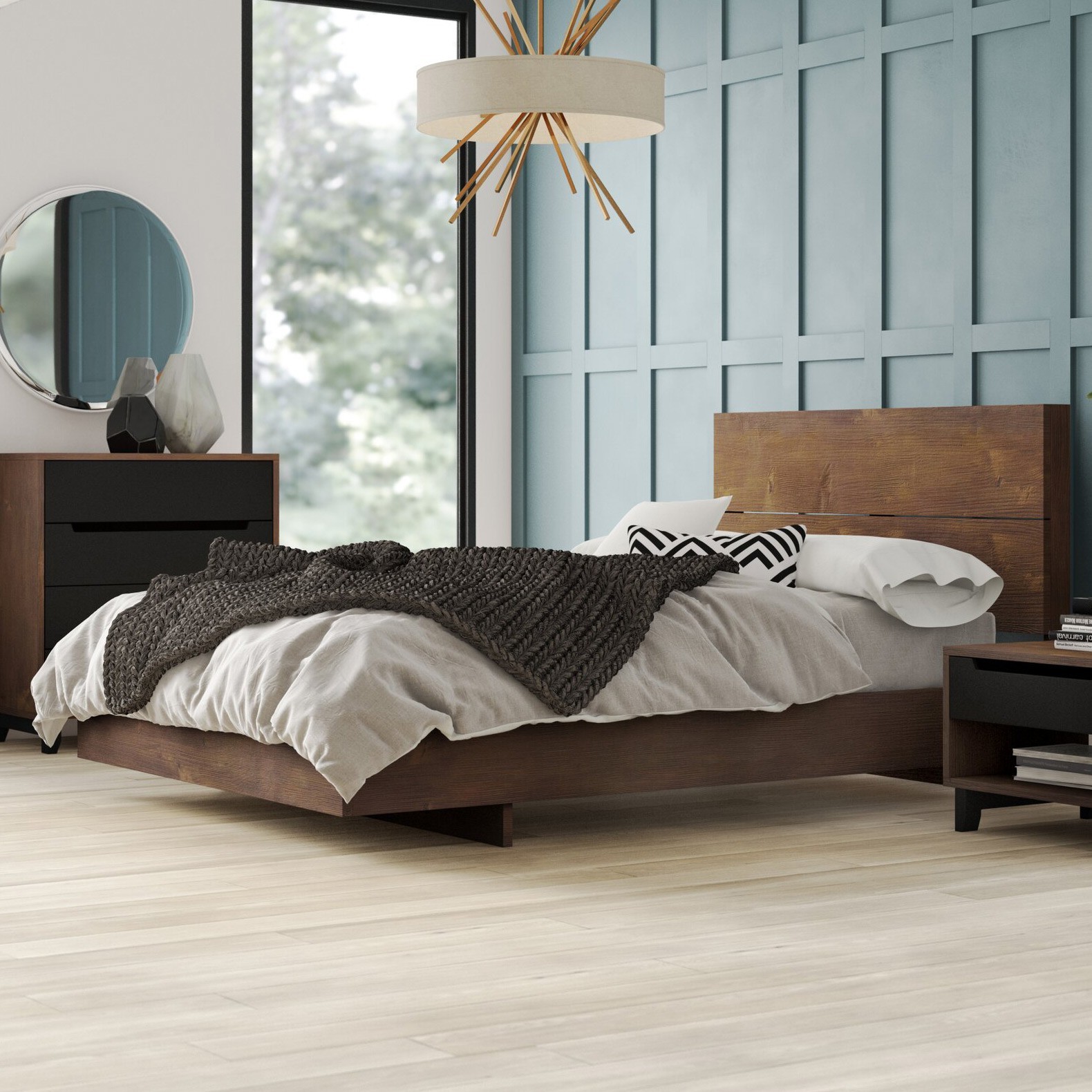 Alçak profilli yatak ve başlık, geniş tahta yapıya sahiptir.